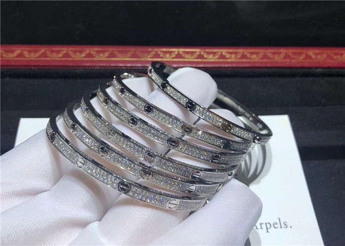 सॉलिड गोल्ड ब्रांड लव कंगन, छोटा मॉडल, 18K सफेद सोना, 177 चमकदार कट हीरे के साथ सेट कुल 0.95 कैरेट। एक स्क्रूड्राइवर के साथ आता है।